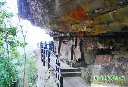 羅漢迎賓上方西南側(cè)石壁上,有一處空間高約3米、深1-3米、長(zhǎng)20多米的巖屋,是絕妙的觀景臺(tái)。登臺(tái)南眺,遠(yuǎn)山如黛。近處左上側(cè)有石峰數(shù)座,倚天而列。北邊一峰類人,西向側(cè)面而立,似頭著兜鍪,身披甲胄,左臂下垂,傲視藍(lán)天,游人戲稱“獨(dú)臂武將”。巖屋下20米,一峰如葫蘆豎立,高約30米,直徑約10米,底、肚、頸、口俱全,附生的草木如花紋圖飾,一塊重達(dá)數(shù)噸的石板蓋于口上,稱”仙丹葫蘆“。對(duì)面一組山峰形如駱駝踽踽東行。駱駝前方是一山坡,有草無(wú)樹(shù),夏日青似草原,秋天黃如大漠,駱駝?wù)蚰抢镒呷ァ?/p>