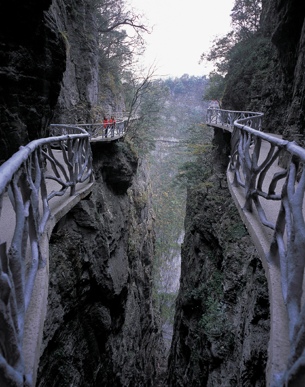 站在棧道上俯瞰群山,古人“會當(dāng)凌絕頂,一覽眾山小”的感覺油然而生。由于天門山是國家森林公園,植被特別豐富,加上典型的喀斯特地貌,所以,在這條棧道上更能找到一種在乘坐直升飛機(jī)飛越熱帶雨林大峽谷的感覺,這平時只能在電影里看到的場景,在這里能讓你身臨其境。