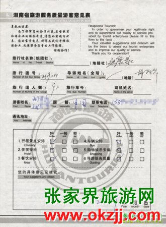 2009年11月14日劉先生一行9人旅游接待質(zhì)量反饋單: